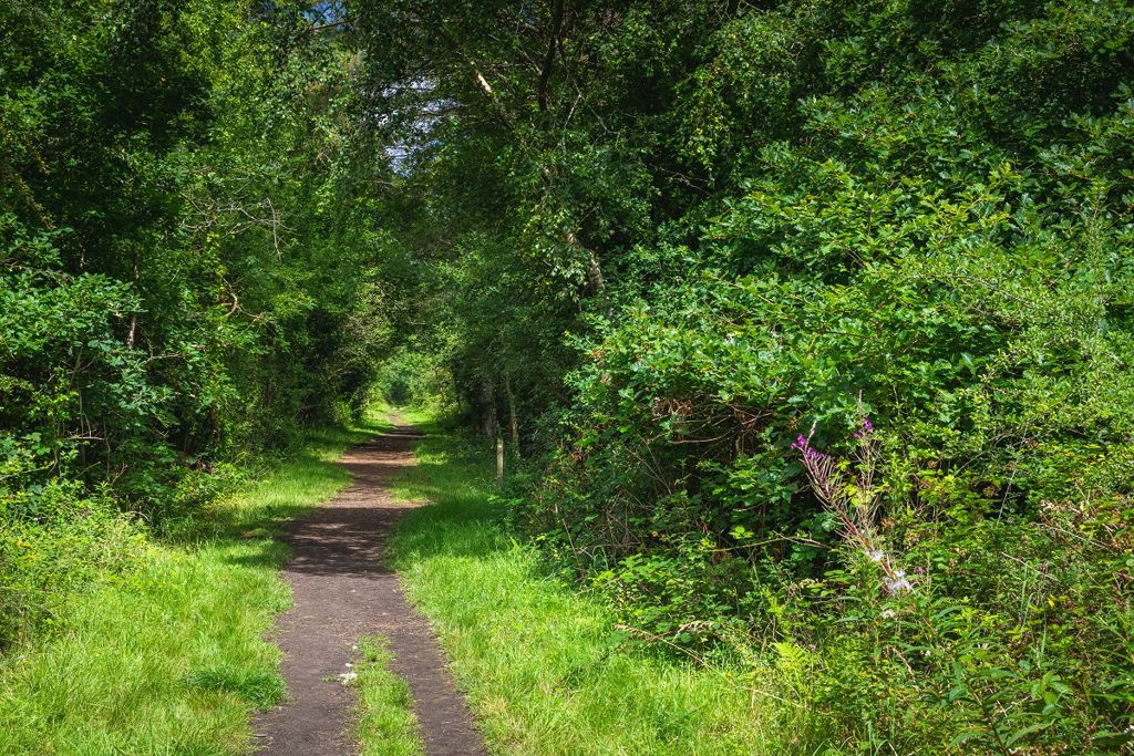 Mae arwyddbyst ar y llwybr cerdded drwy’r coetir ac mae’n dilyn y rheilffordd nas defnyddir erbyn hyn.