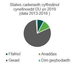 Canfu pedwerydd adroddiad y DU ar Erthygl 17 o’r Gyfarwyddeb Cynefinoedd (2019) fod 35% o'r rhywogaethau a restrwyd ac 8% o gynefinoedd ar statws cadwraeth ffafriol ar lefel y DU: