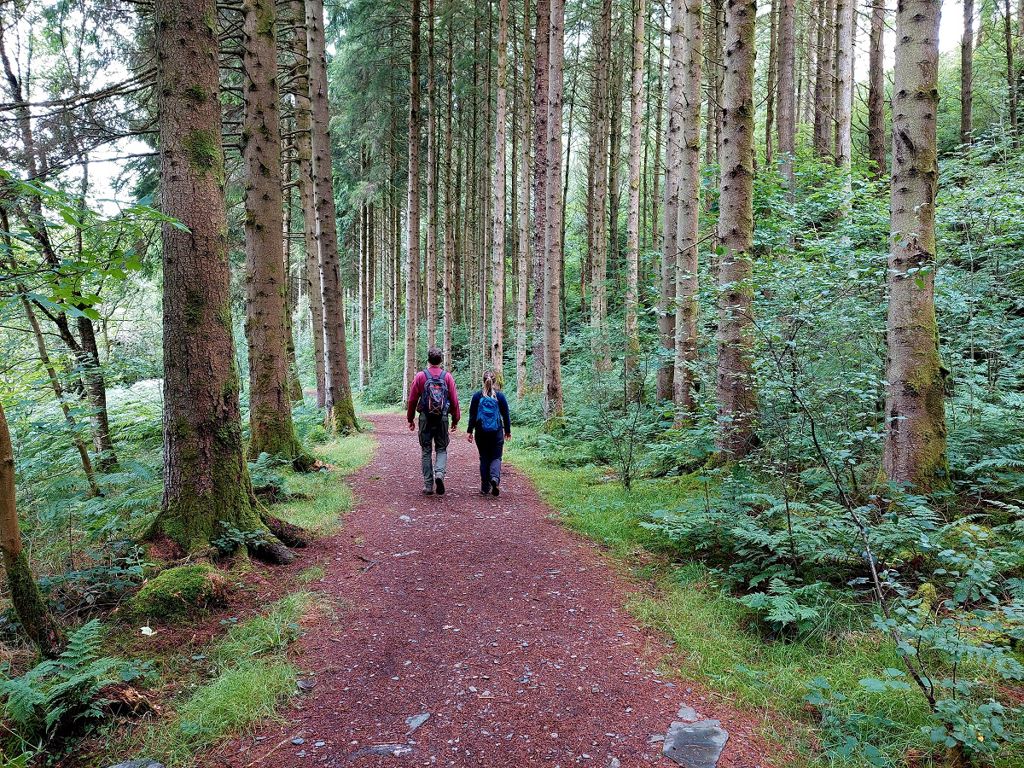 Mwynhewch sŵn yr afon a chadwch lygad am y coed sbriws Sitka mawr gyda’u rhisgl cennog.