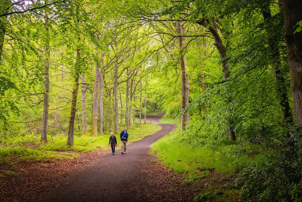 Llwybrau cerdded trwy goed ffawydd enfawr gyda...