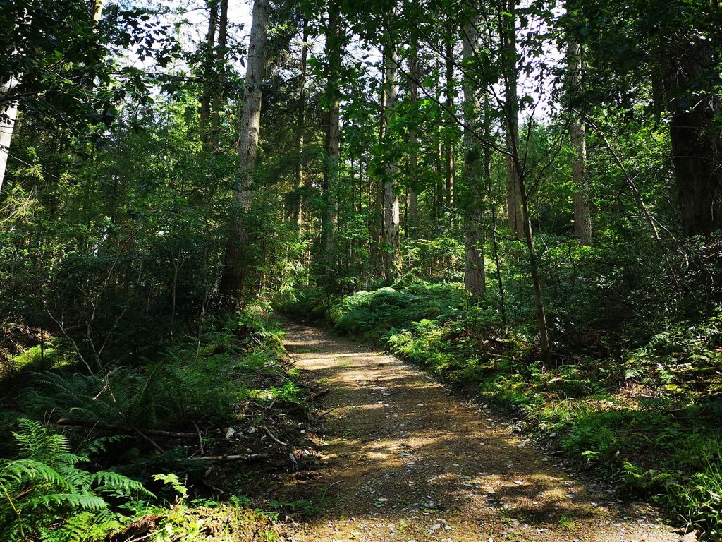 Mae’r llwybr hirach hwn yn dringo i fyny drwy goed ffynidwydd Douglas anferthol.